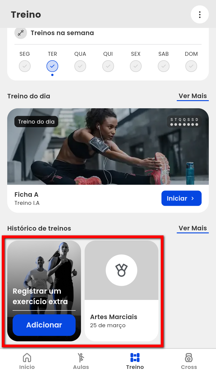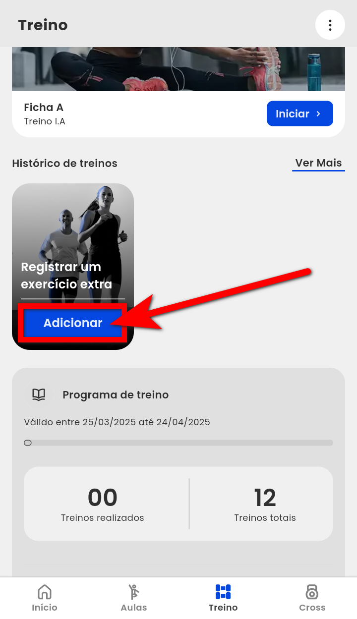 Pelo app Treino o aluno pode registrar manualmente suas atividades físicas extras, aquelas realizadas além dos treinos da ficha.