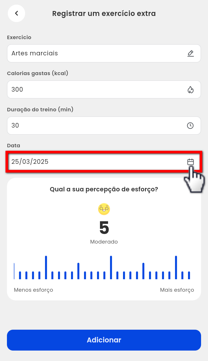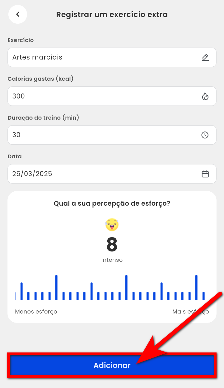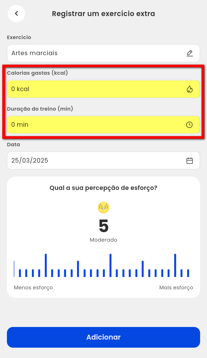 2. Em seguida, o aluno deve localizar o campo "Registrar um exercício extra" e clicar em "Adicionar";