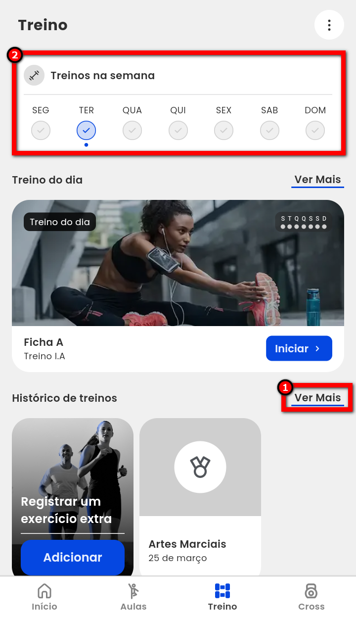 8.1. O aluno pode visualizar todo o seu histórico de treinos clicando em "Ver mais" ou acessando diretamente pelo calendário.