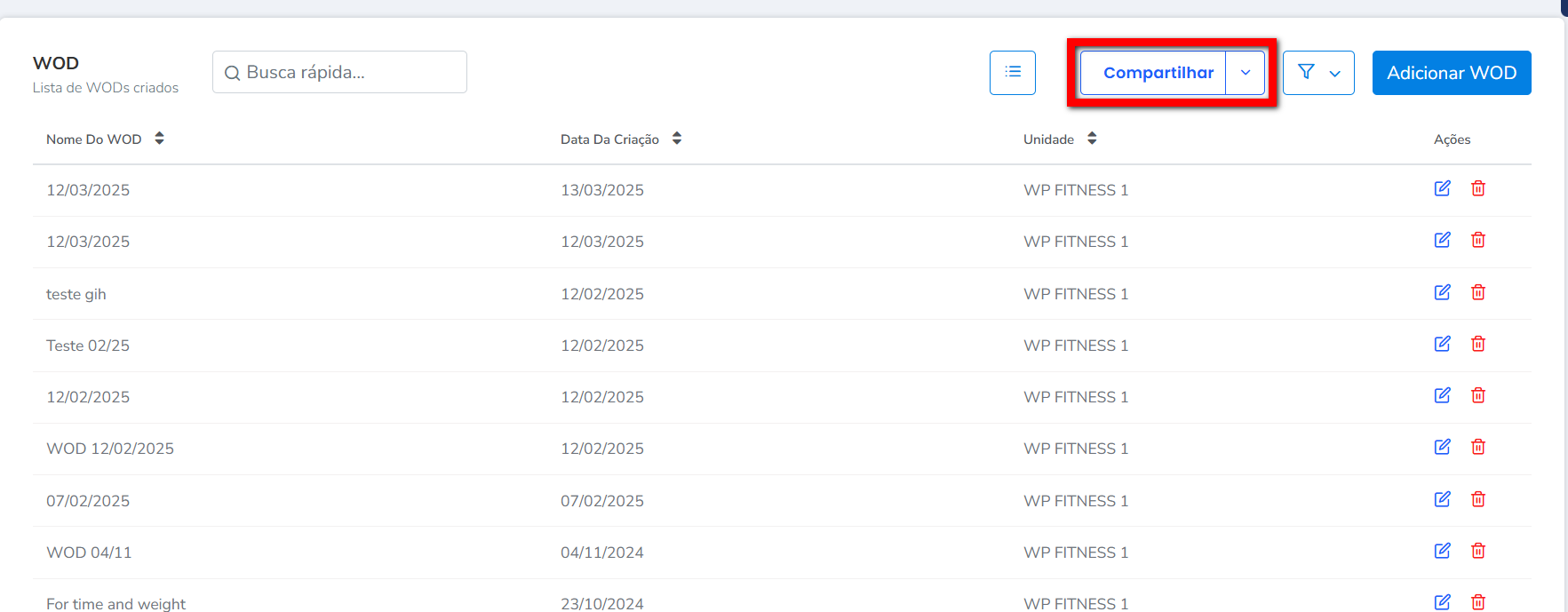 2. Será exibida a tela com o cadastro de todos os WOD já lançados no sistema. Para incluir, enviar ou imprimir clique em "Compartilhar";