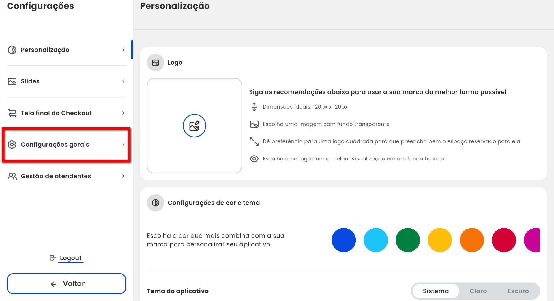 2. Será apresentada esta tela, clique em “Configurações gerais”;