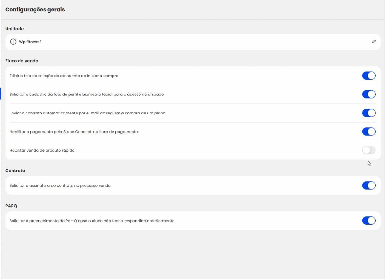 3. Em “Fluxo de venda” habilite a configuração "Habilitar venda de produto rápido";