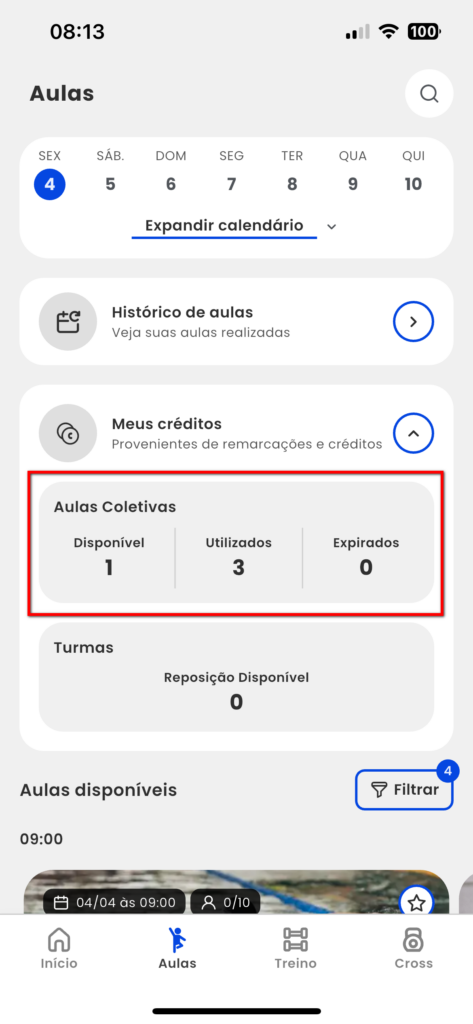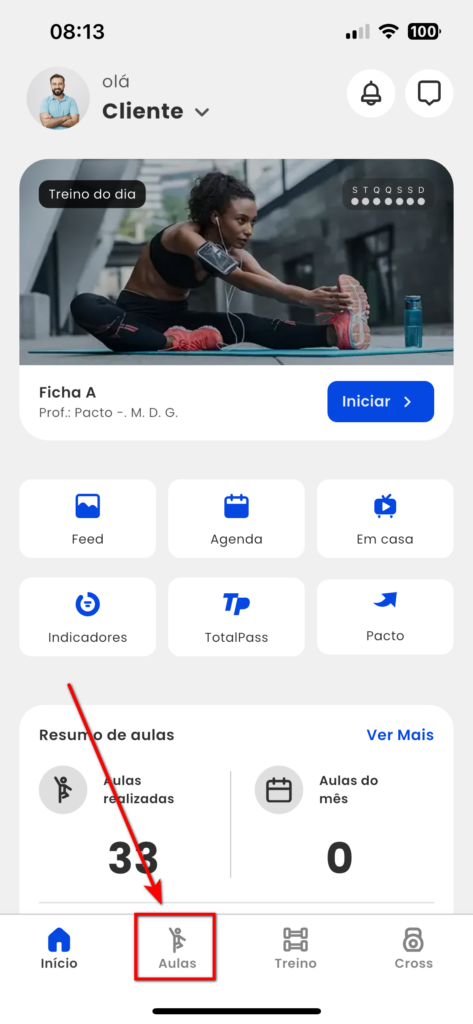 1. O aluno ao acessar o app Treino deve clicar na guia "Aulas";