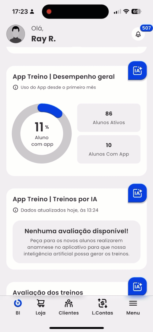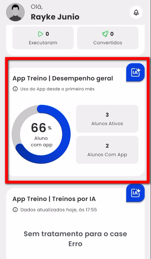 - Alunos com o app: apresenta os clientes que estão com App Treino instalado, independente de estarem ativos ou não.