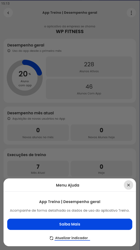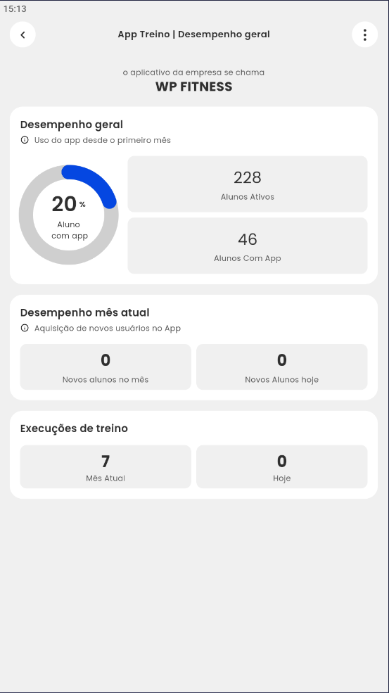 - Aluno com app: apresenta a porcentagem de alunos que tem App Treino cadastrado ativos ou não;