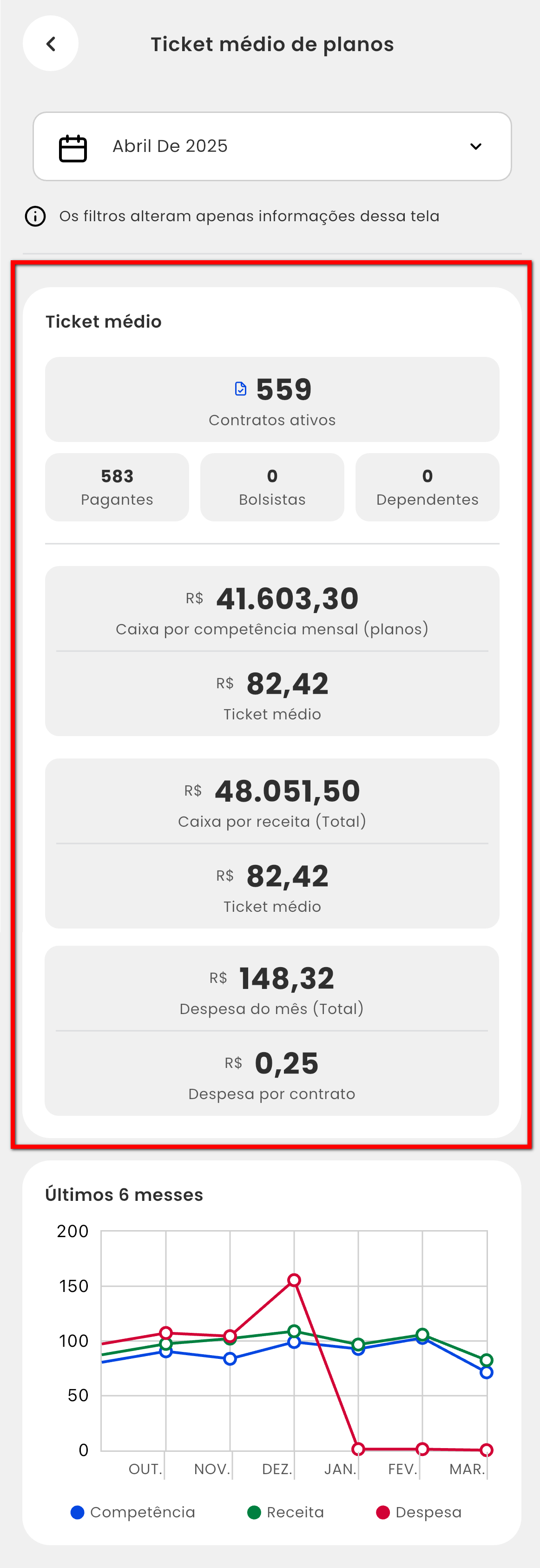1. No menu “BI” do aplicativo, localize o indicador “Ticket Médio de Planos“;