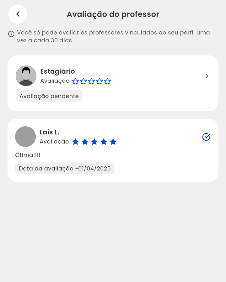 📌 Por Exemplo: no dia 01/04, o aluno avaliou a professora Lais. Porém, no dia 11/04, houve uma alteração de carteira e o aluno passou a ser responsabilidade da professora Gih. Nesse caso, o aluno poderá realizar uma nova avaliação, agora para a nova professora.