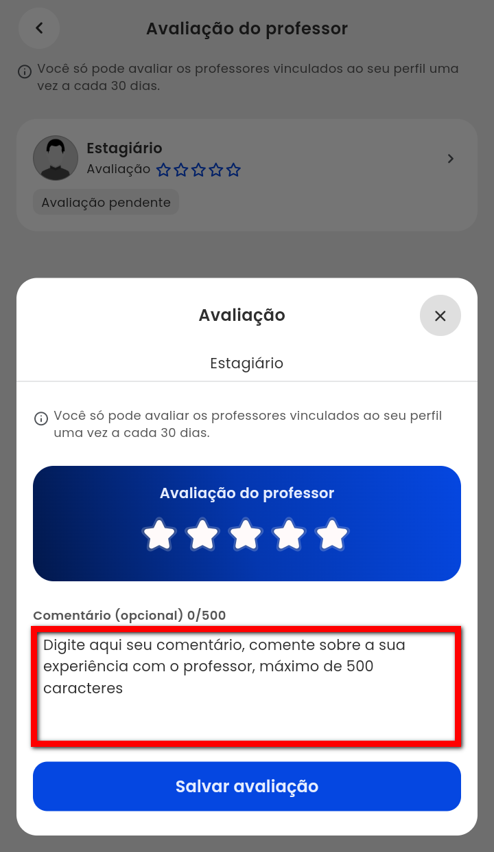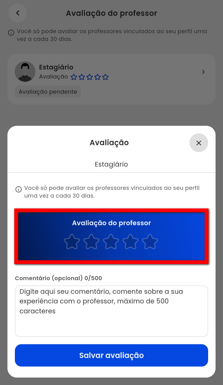 Atenção: o aluno só pode avaliar o professor associado a ele uma vez a cada 30 dias ou quando houver uma troca de professor no Treino Web.