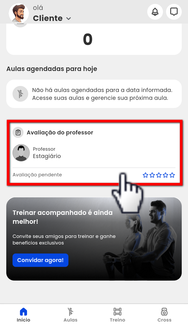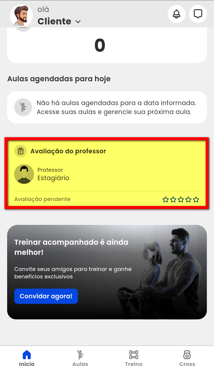 1. Na página inicial do aplicativo Treino, localize o card "Avaliação do Professor";
