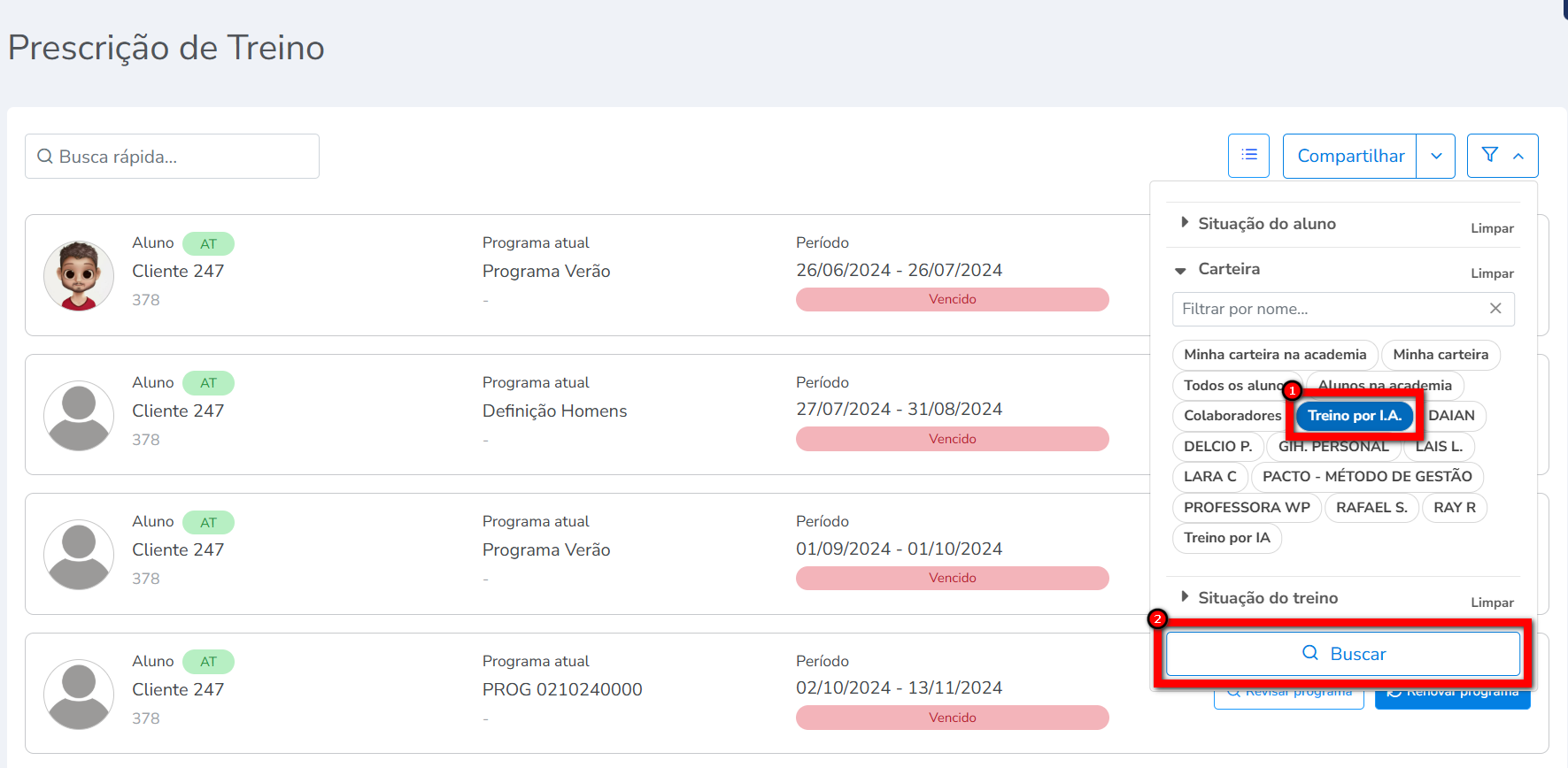 2. Na tela de “Prescrição de Treino“, utilize o filtro “Carteira” e selecione “Treino por I.A.“;
