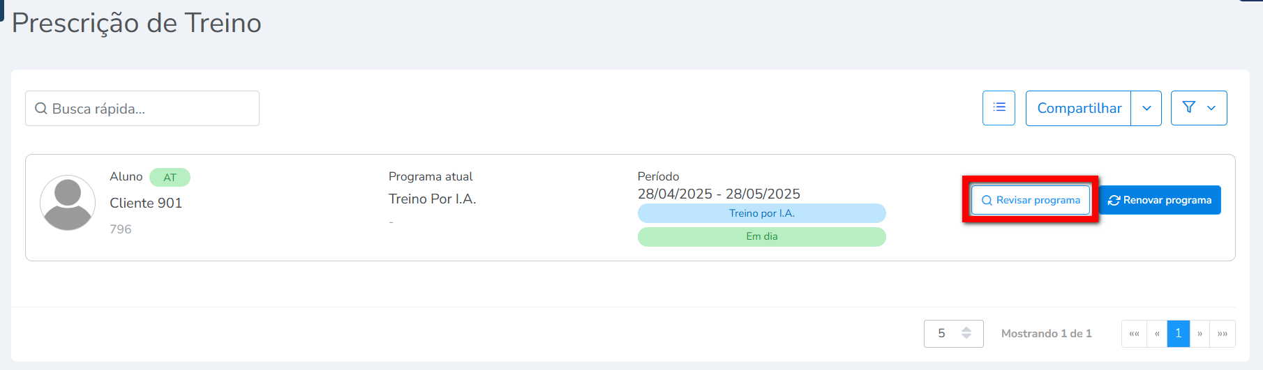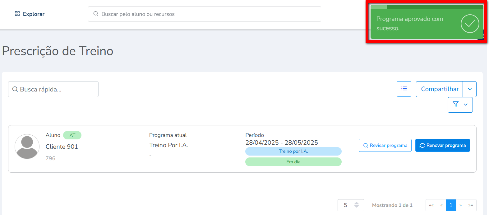 3. Após a realização do filtro, será apresentado os alunos que tiveram o treino criado pela IA. Localize o aluno desejado e clique em “Aprovar programa“;