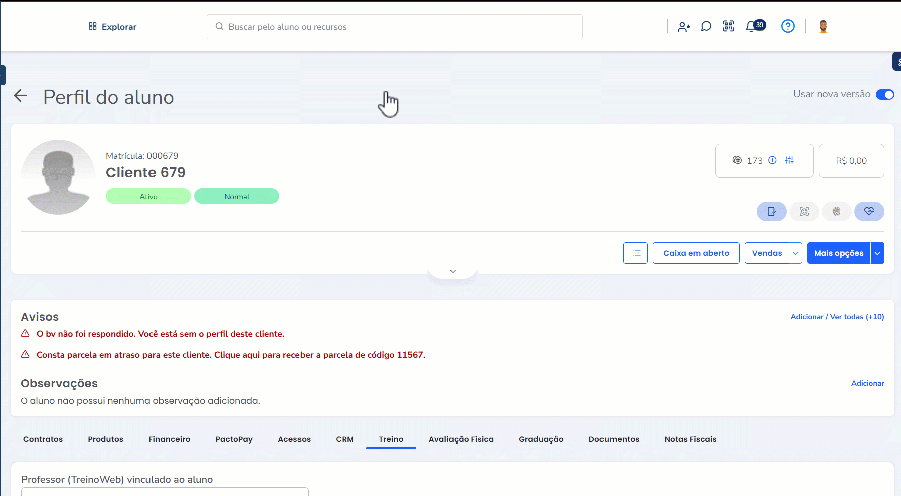 No sistema Web, no treino do aluno