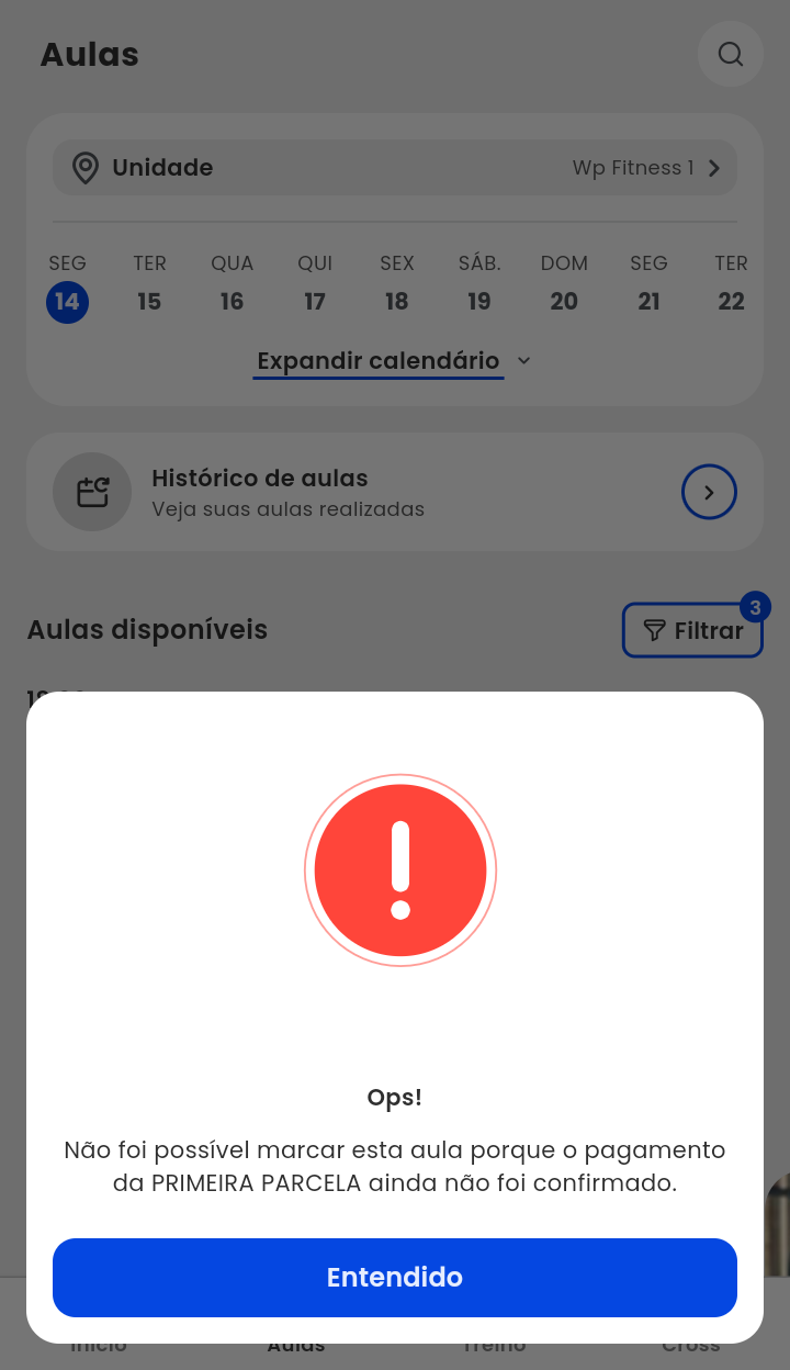 6. Agora, sempre que um aluno tentar realizar o check-in em uma aula coletiva sem ter pago a primeira parcela, o sistema irá bloquear o acesso e impedir a marcação;