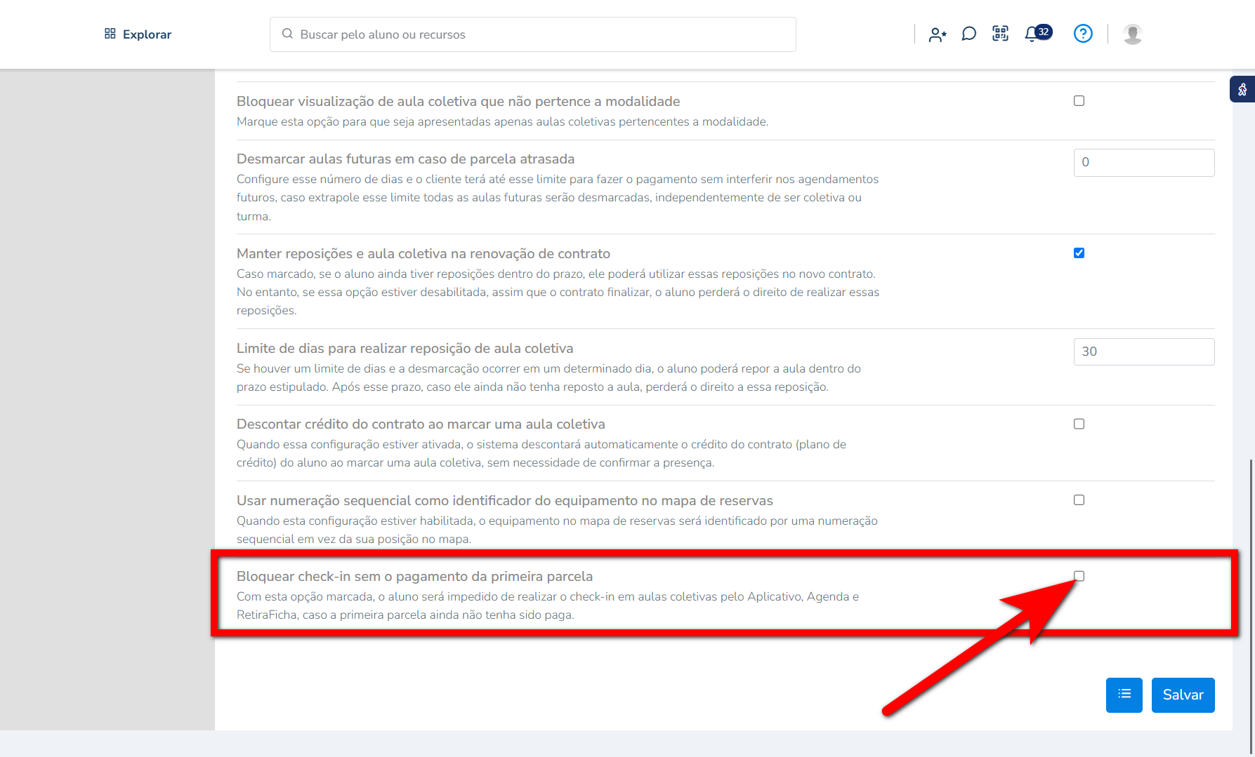 4. Em seguida, localize e marque a configuração “Bloquear check-in sem o pagamento da primeira parcela";