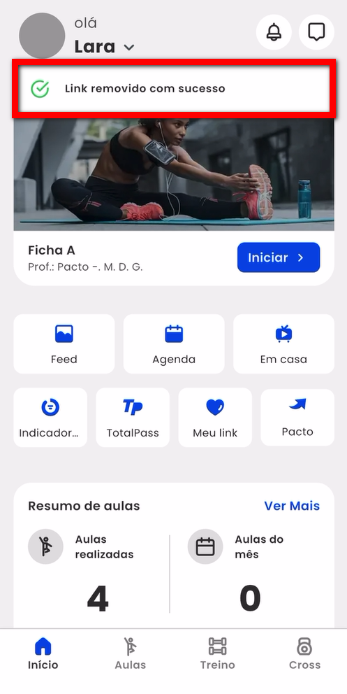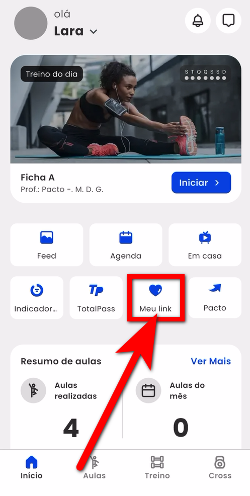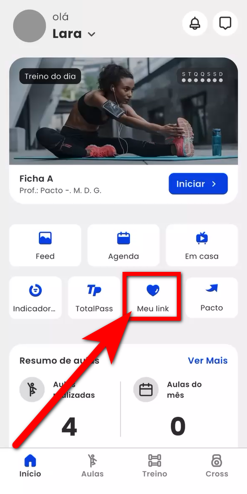 1. Na tela inicial do aplicativo Treino, o aluno deve localizar e clicar na opção "Meu Link";