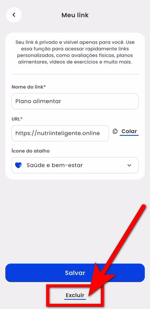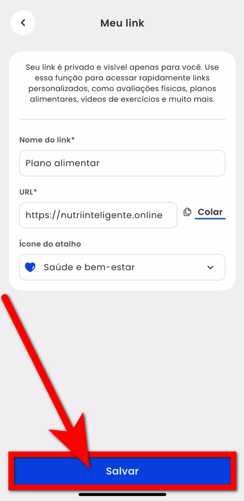 Com essa funcionalidade, o aluno poderá cadastrar um link pessoal, como um laudo de avaliação física, vídeos externos, arquivos em nuvem ou qualquer outro material de apoio que faça parte da sua jornada.