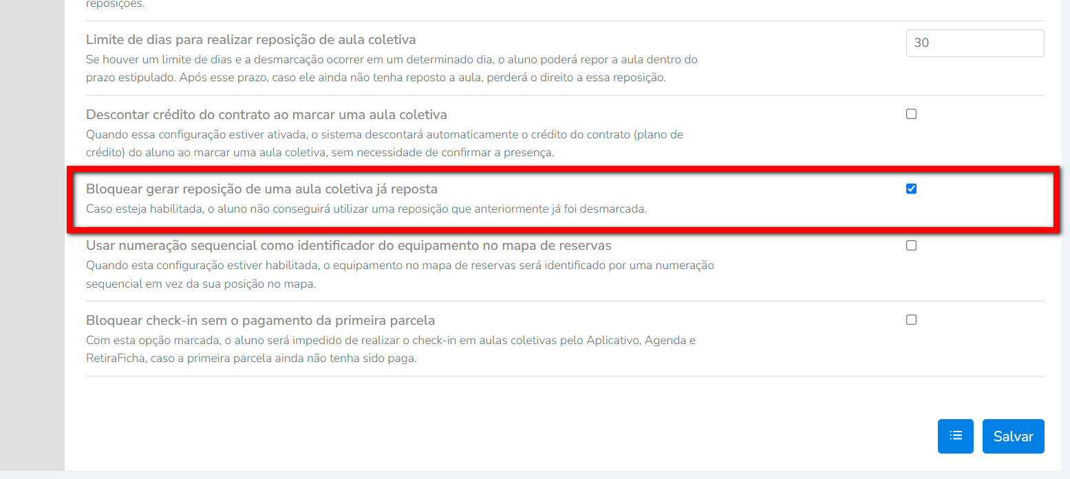 4. Habilite a configuração "Bloquear gerar reposição de uma aula coletiva já reposta";
