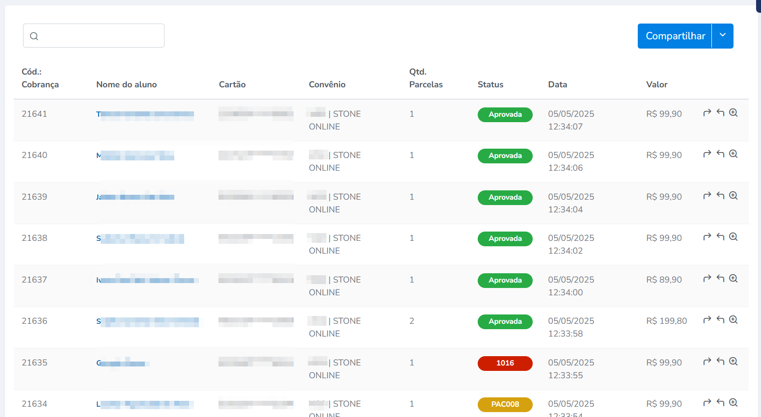2. O sistema apresenta a tela contendo as informações de cobrança nos convênios de cobrança de cartão online;