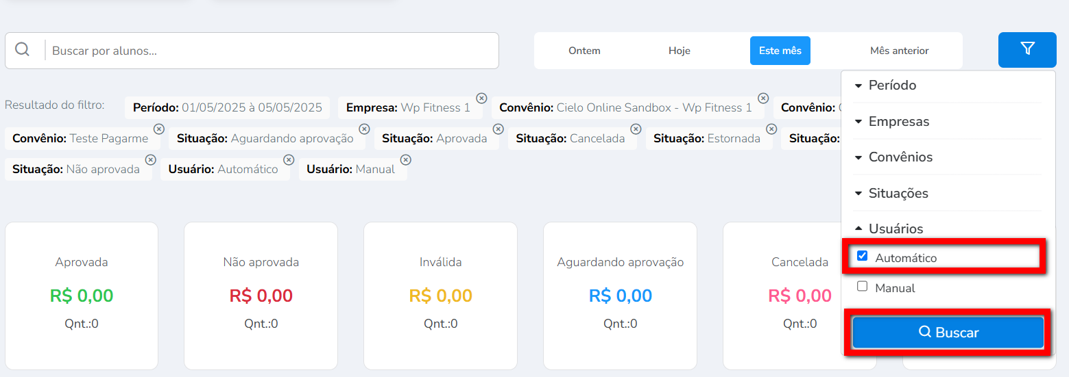 3. Clique no filtro e em "Usuários", marque a opção "Automático" e clique em "Buscar";