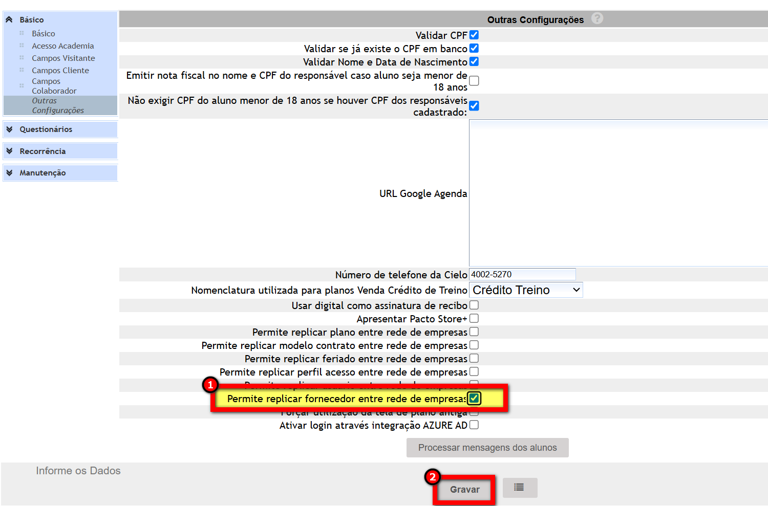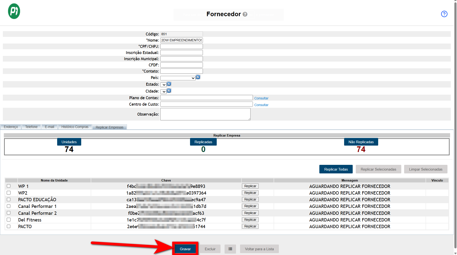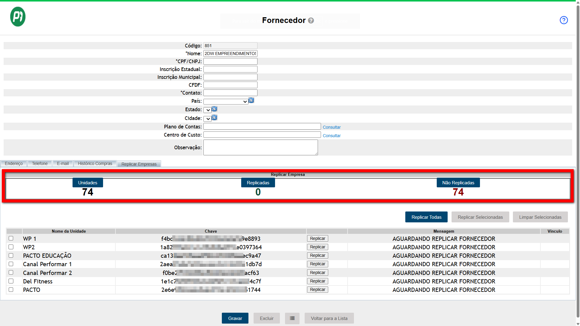 Observação: uma vez que o fornecedor seja replicado, ele será cadastrado automaticamente nas demais unidades. Caso deseje excluir, será necessário realizar a ação individualmente em cada unidade.