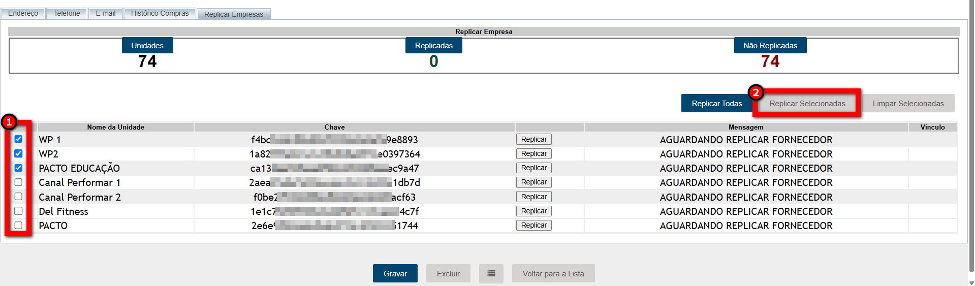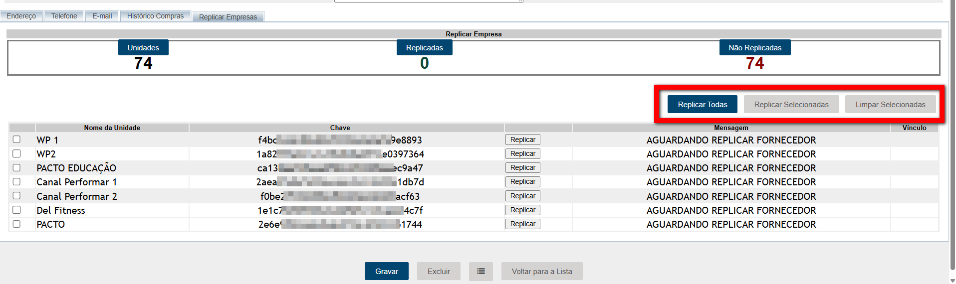 - Replicar selecionadas: utilize essa opção após selecionar as unidades nas quais deseja replicar o cadastro;