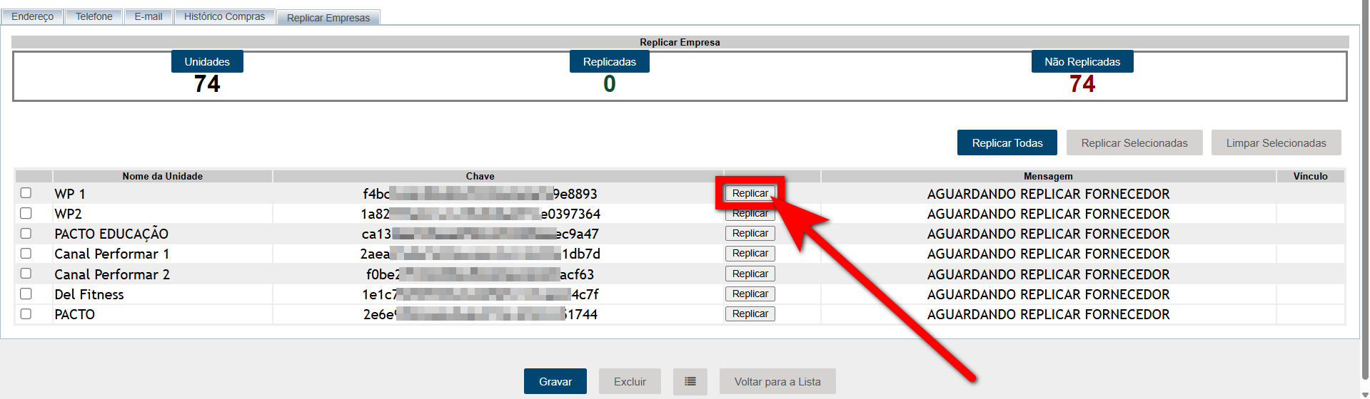 5.2. Caso deseje replicar o cadastro em uma unidade específica, clique em “Replicar” ao lado da unidade desejada.