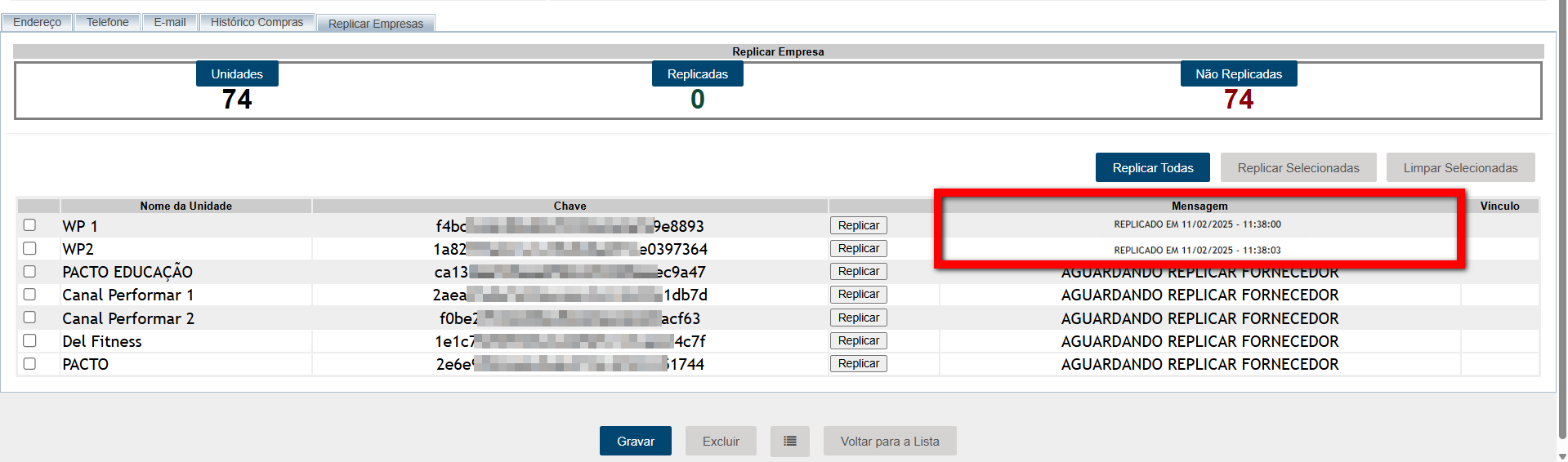 6. Após clicado será exibido na coluna de mensagem quando o cadastro foi replicado;