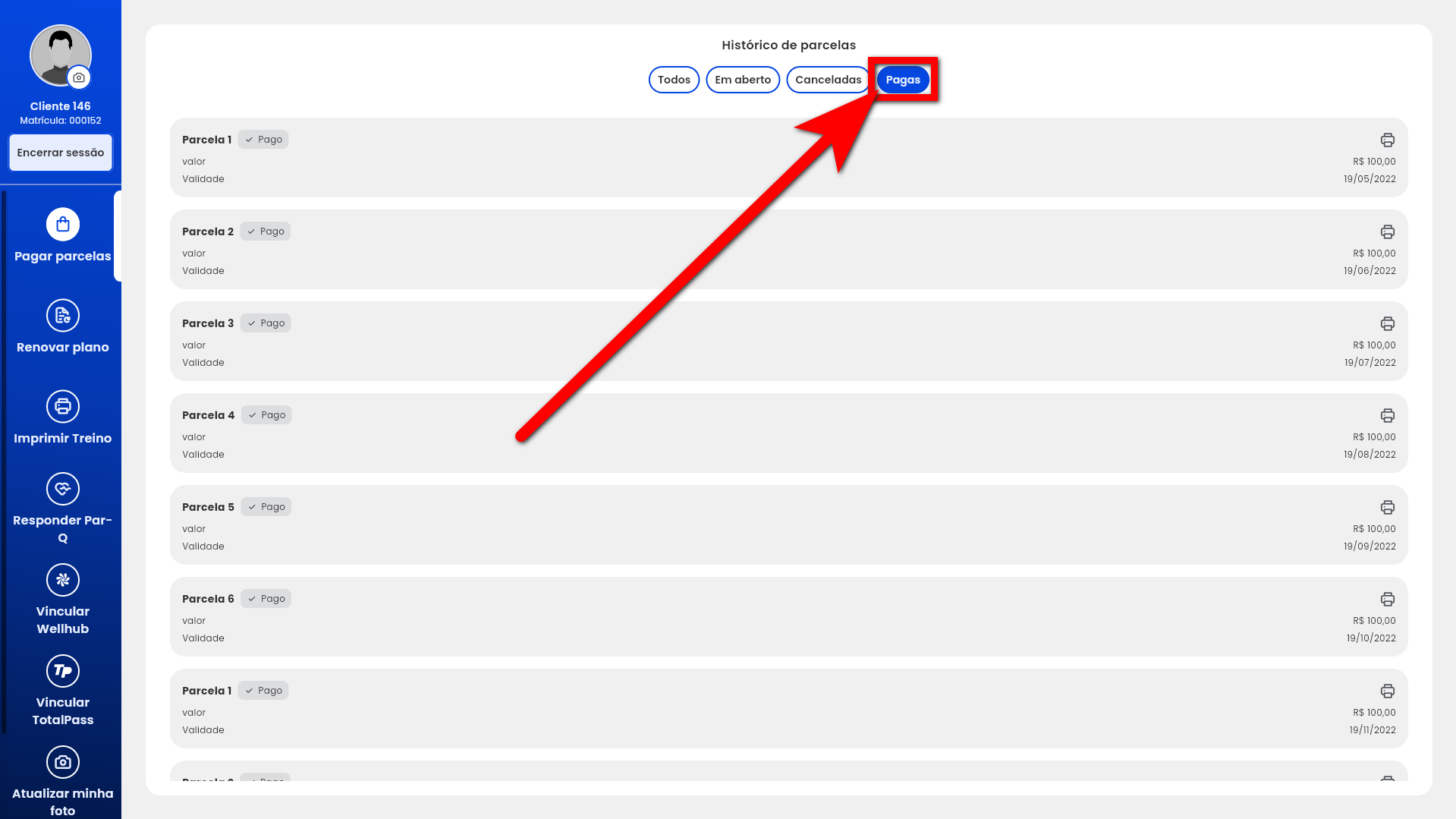 4. Na tela de Histórico de parcelas utilize os filtros para localizar as parcelas “Pagas";