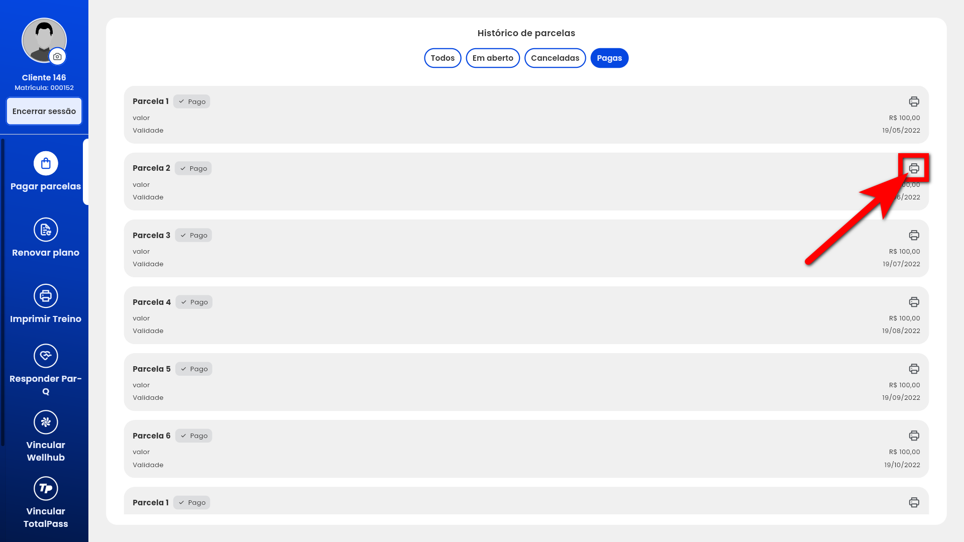 5. Clique sobre o ícone de impressora à frente da parcela;