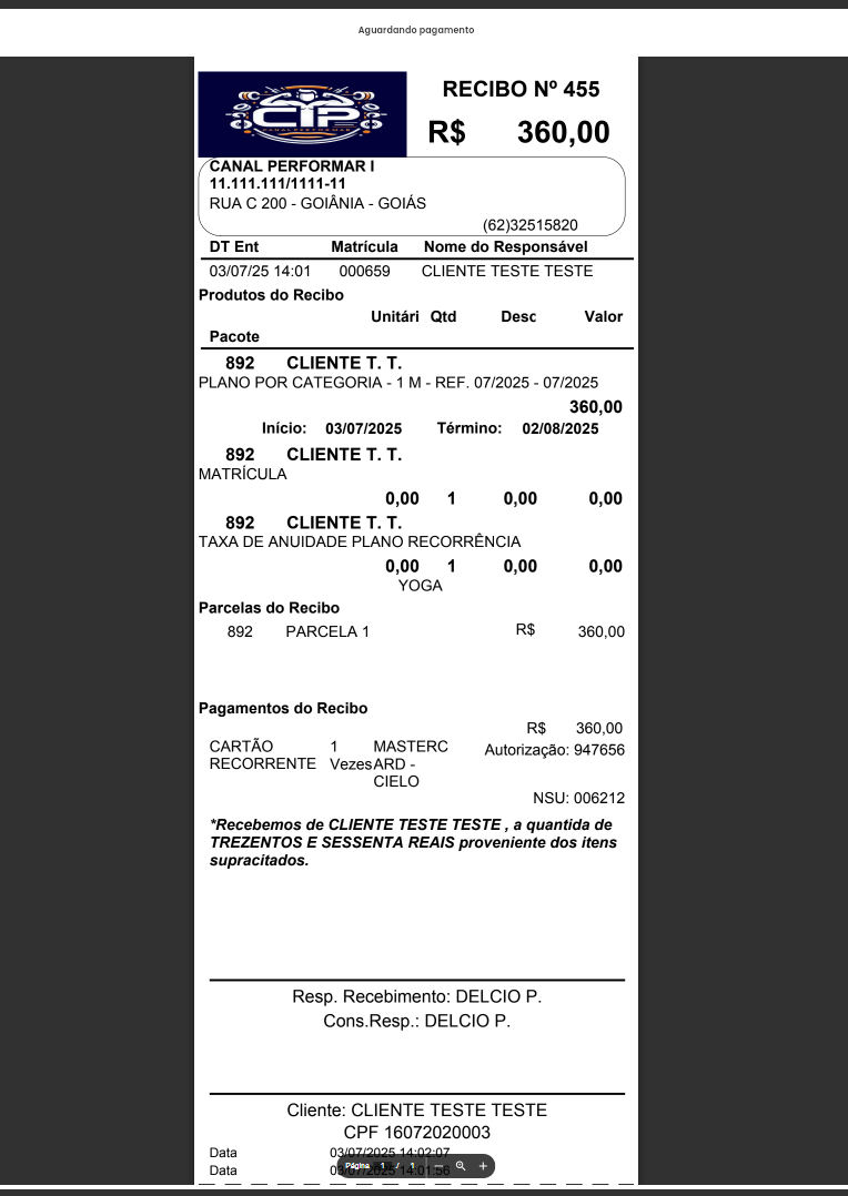 6. Em seguida, o recibo será gerado automaticamente para impressão.