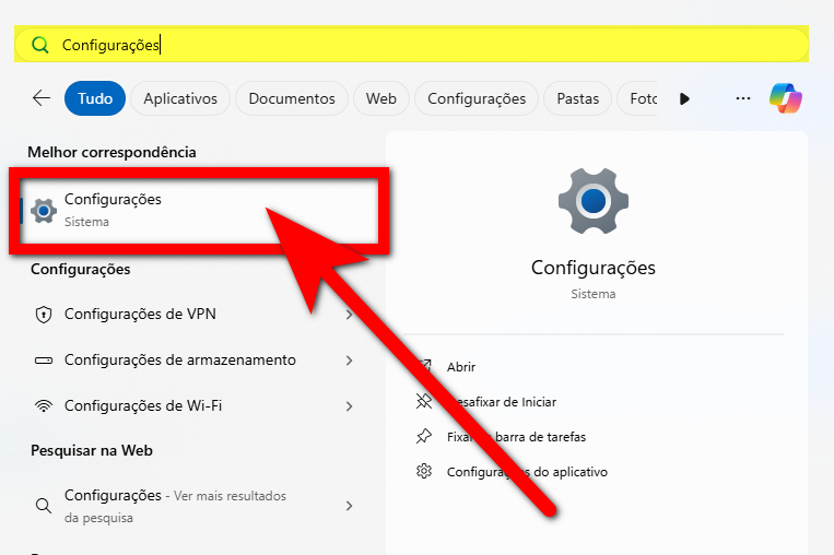 2. Em seguida, digite Configurações e selecione a opção "Configurações" (ícone de engrenagem);