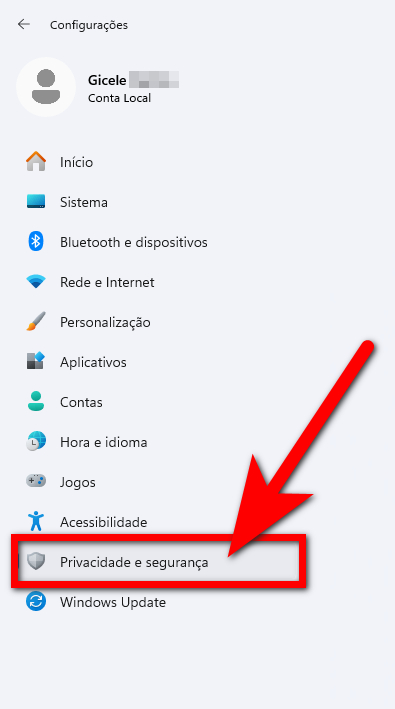 3. Dentro das configurações, na barra lateral à esquerda, clique em "Privacidade e Segurança";