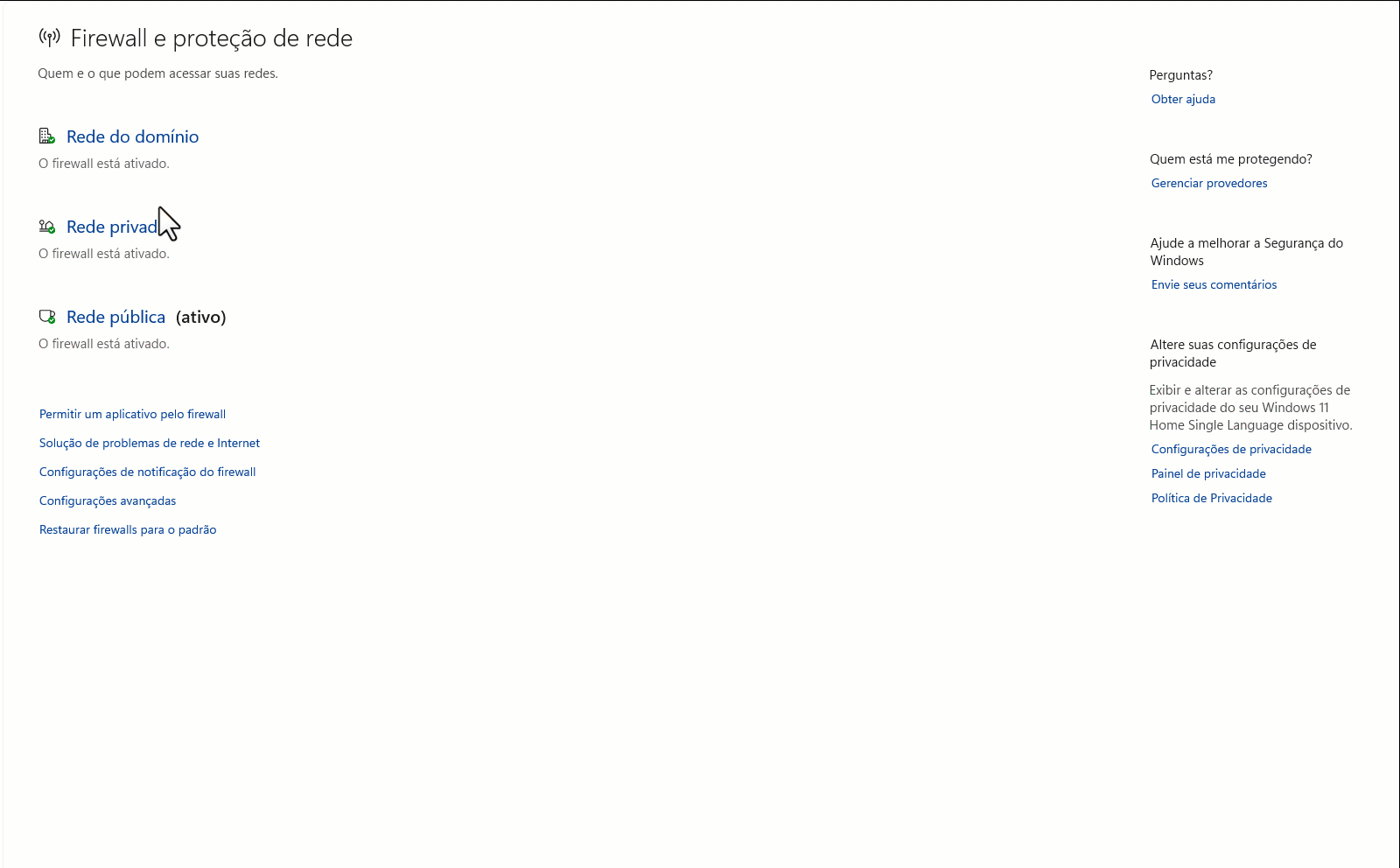 5. Você verá três tipos de redes: "Rede Privada", "Rede Pública" e "Rede de Trabalho". Clique sobre cada uma delas e, em seguida, desative a opção Firewall do Windows Defender clicando no botão para Desativar;