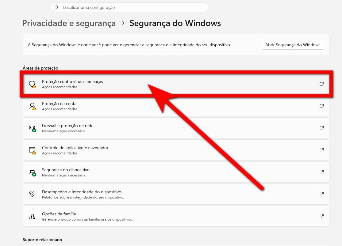 4. Na seção "Segurança do Windows", clique em "Proteção contra vírus e ameaças";