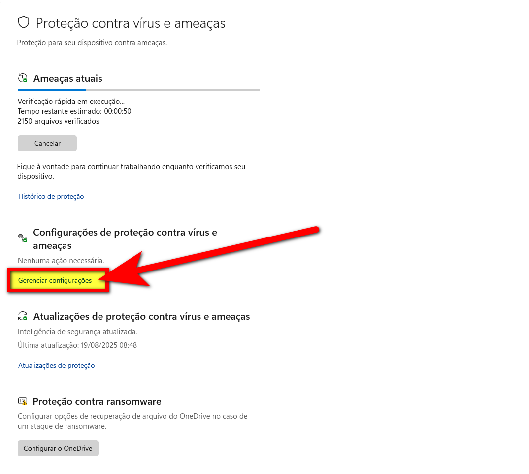 5. Dentro da opção de proteção contra vírus, clique em "Gerenciar configurações";