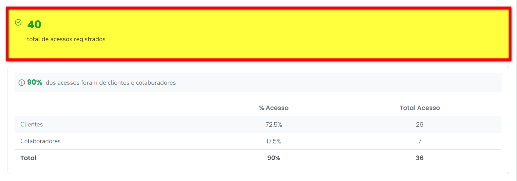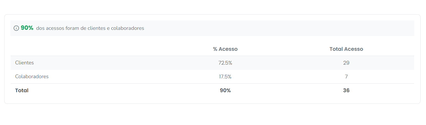 3.2. No primeiro quadro é apresentada a separação dos acessos, mostrando quantos do Total de Acessos são de clientes e quantos de colaboradores, além do percentual que cada indicador representa sobre o total;