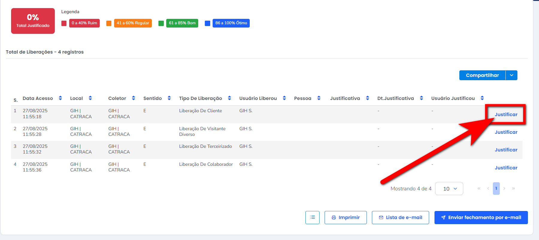 4.1. Caso tenha algum acesso que ainda não possui uma justificativa, basta clicar em “Justificar“;
