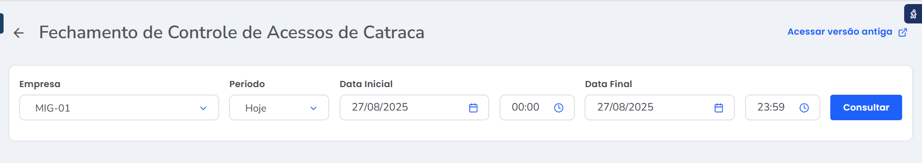 2. Ao exibir a nova página de Fechamento de Controle de Acessos de Catraca, realize os filtros como desejar;