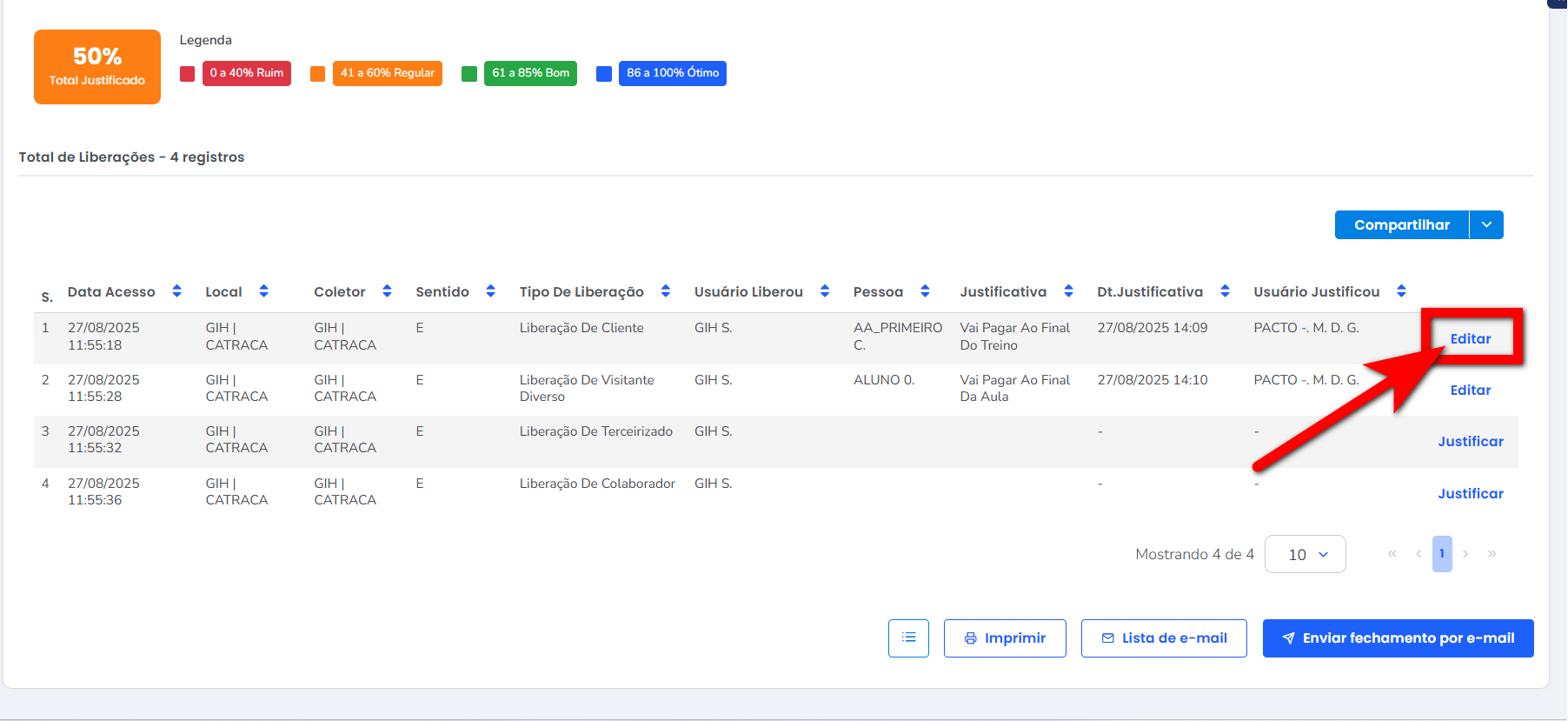 4.2. Caso precise editar alguma justificativa, basta clicar em “Editar“.
