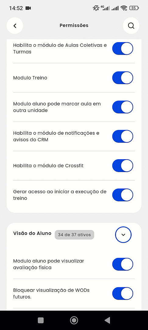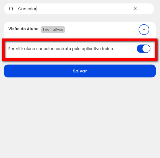 4. Localize e marque a permissão “Permitir aluno cancelar contrato pelo aplicativo treino“;