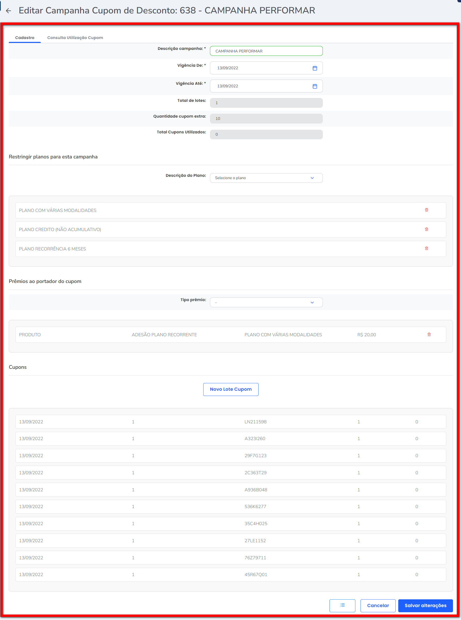 - Total de lotes: mostra a quantidade de lotes de cupons gerados no sistema;