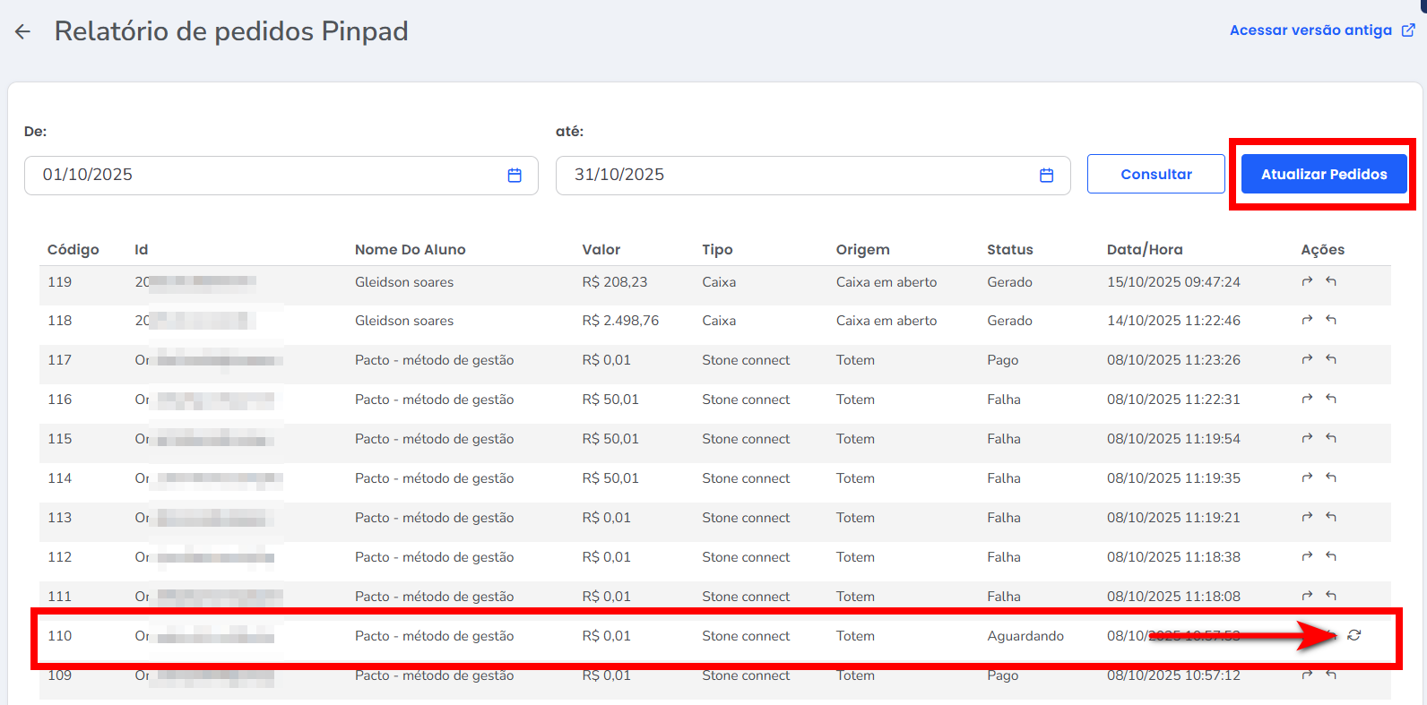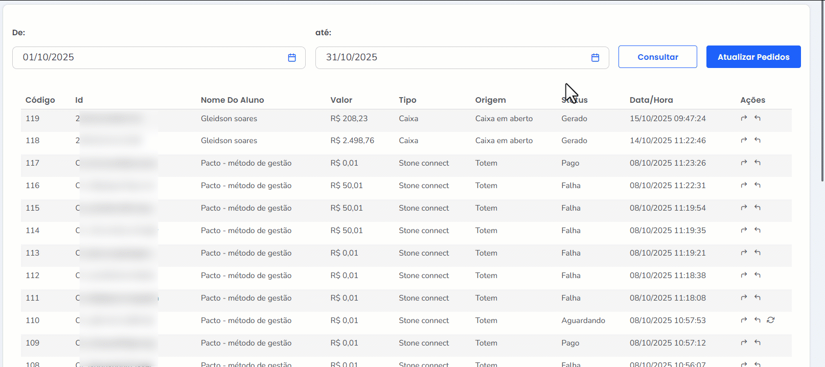 3. Após realizar a consulta, será apresentada a lista com todas as solicitações de cobrança realizadas. As informações apresentadas são: Código, Id, Nome do aluno, Valor, Tipo, Origem, Status, Data/Hora, Ações.