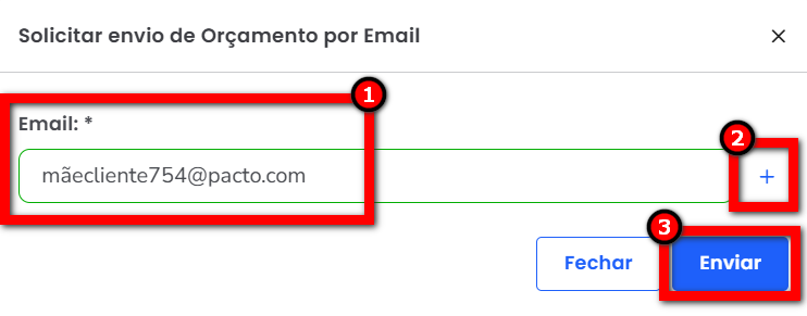 Observação: ao escolher o envio por e-mail, será apresentada uma tela onde vai informar o e-mail que irá receber o orçamento e clicar no ícone para adiconar. Por fim, clique em "Enviar".