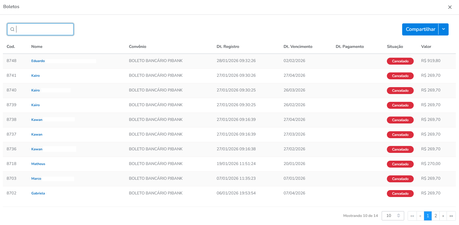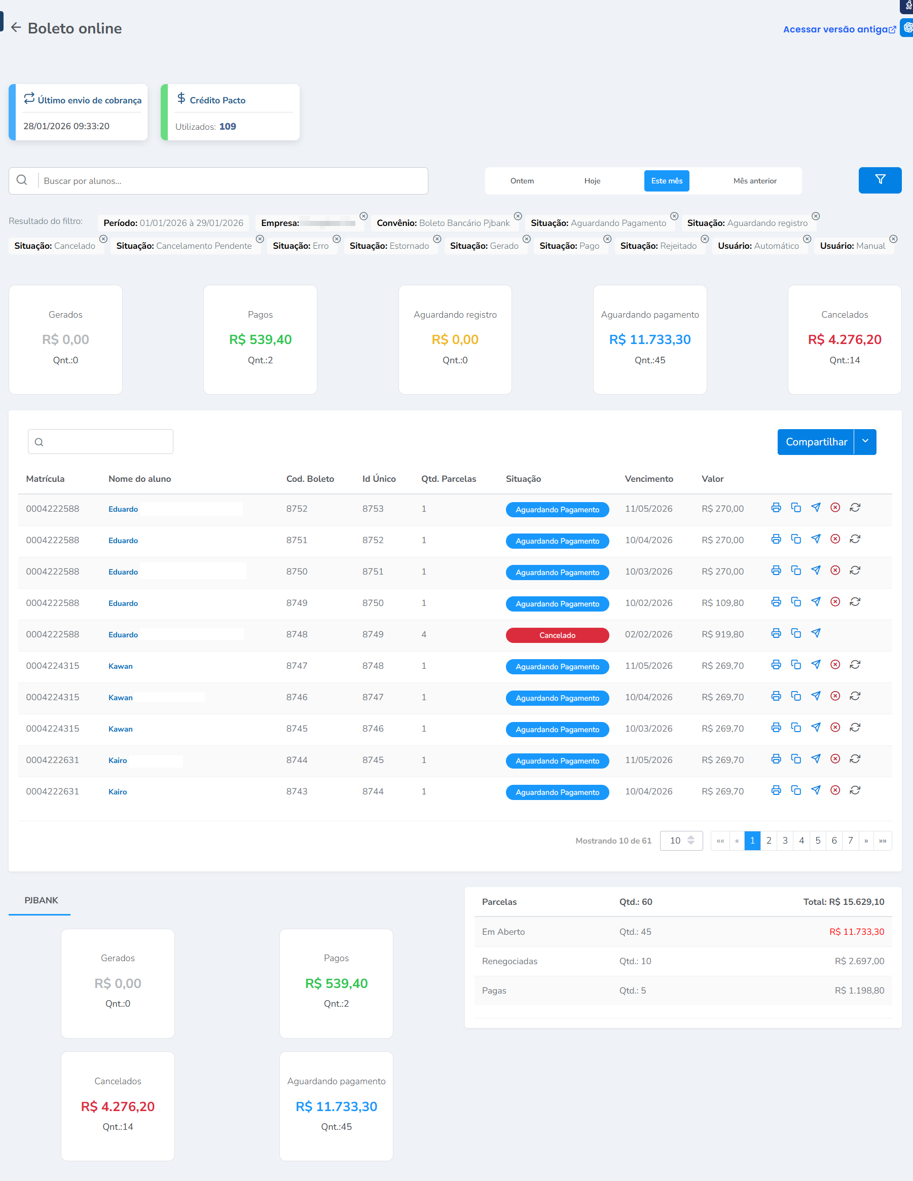 - Cancelados: boletos que foram cancelados no sistema e não podem mais ser pagos.