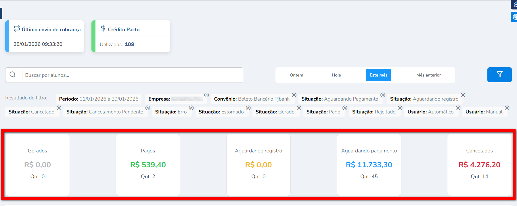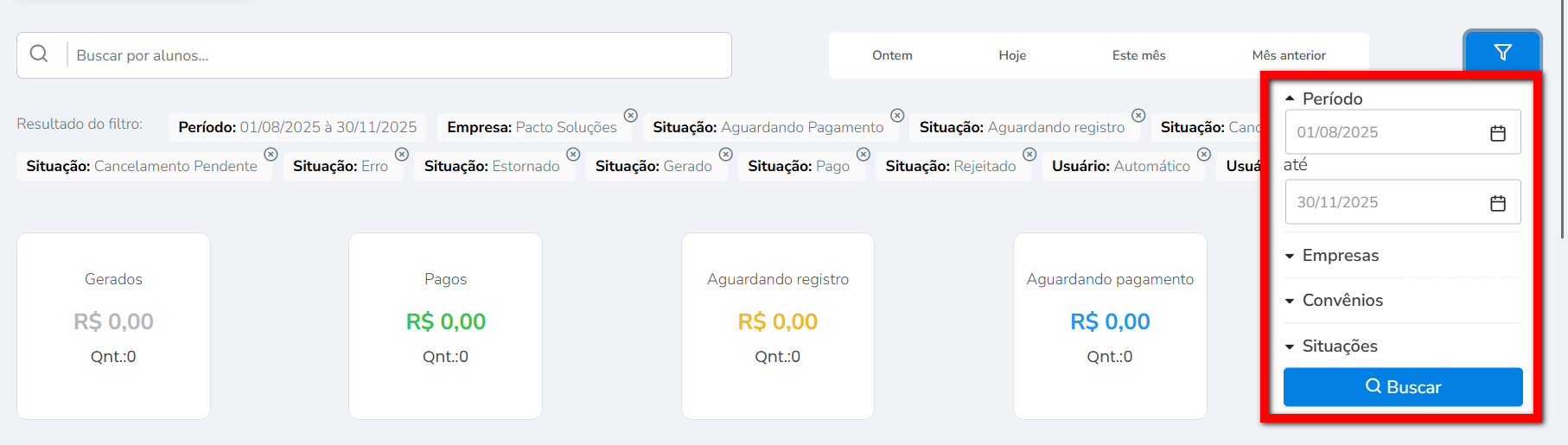 2.2. Na segunda parte da tela temos os filtros que estão sendo aplicados para apresentar os dados. Nestes filtros é possível buscar por nome do aluno, datas, empresas (caso seu banco de dados contenha mais de uma empresa cadastrada), convênio de cobrança e situação do boleto;
