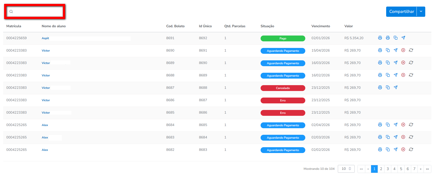2.4. Na quarta parte da tela é apresentada a lista de todos os boletos online do período filtrado/pesquisado;