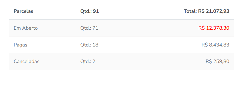2.5. O indicador de “Parcelas” apresenta separadamente por situação atual, todas as parcelas que tiveram cobranças realizadas dentro do período pesquisado. Também apresenta a quantidade e o valor total;