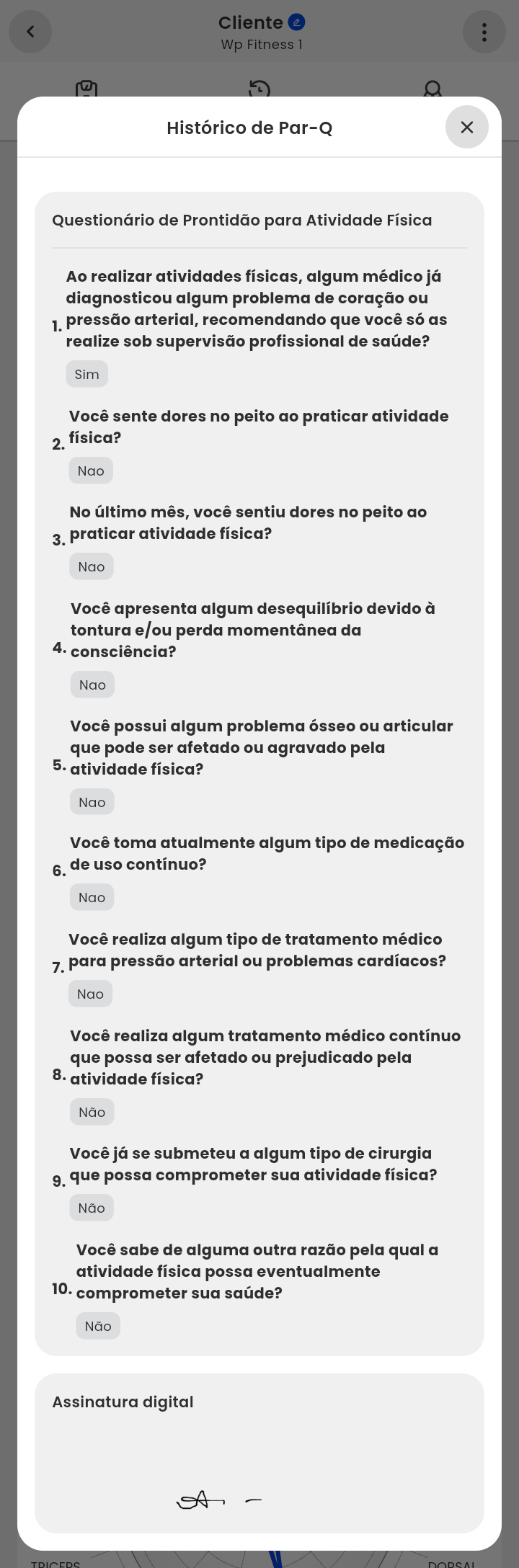 4. Aqui é possível visualizar todas as perguntas e respostas do PAR-Q, além da assinatura.