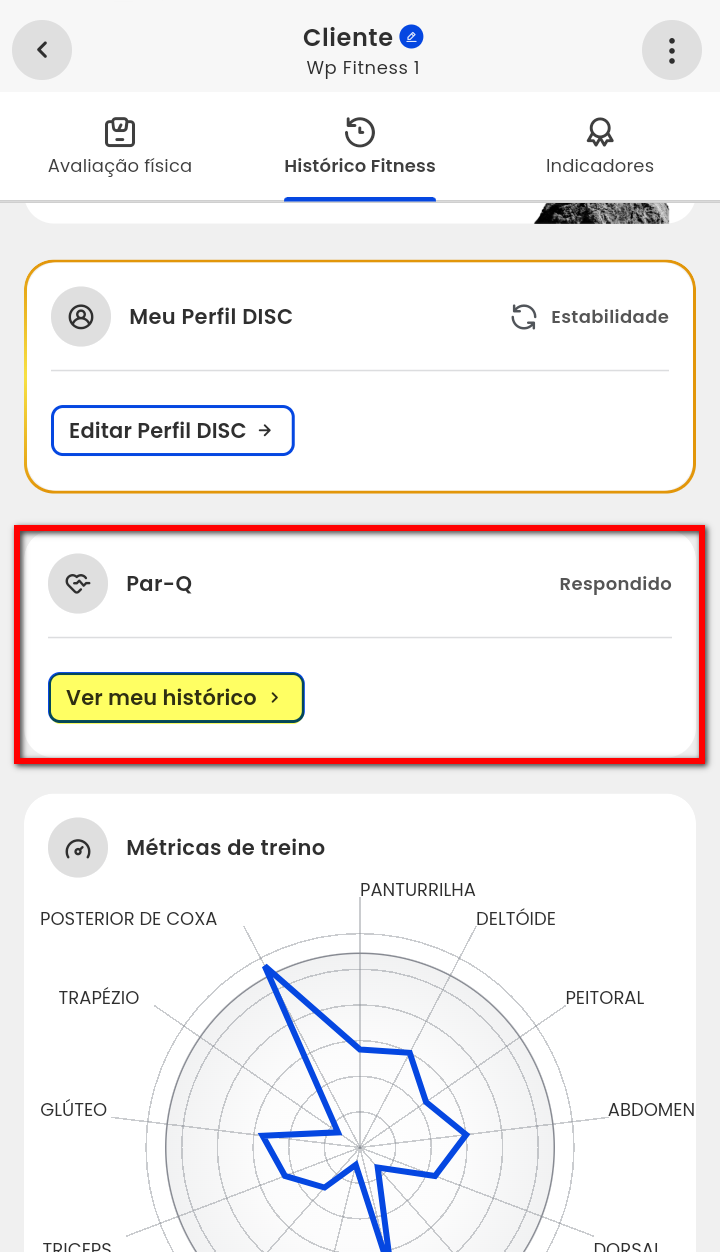Através do App Treino, o aluno pode visualizar e acompanhar no aplicativo o histórico de respostas do PAR-Q.