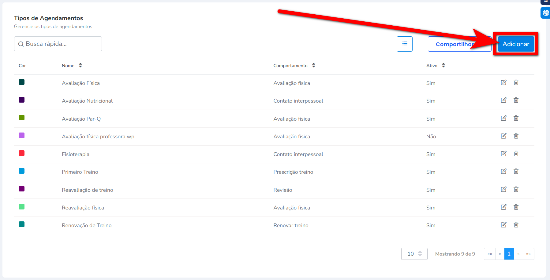 3. Será apresenta a tela com os tipos de agendamentos cadastrados. Para cria um novo clique em “Adicionar“;